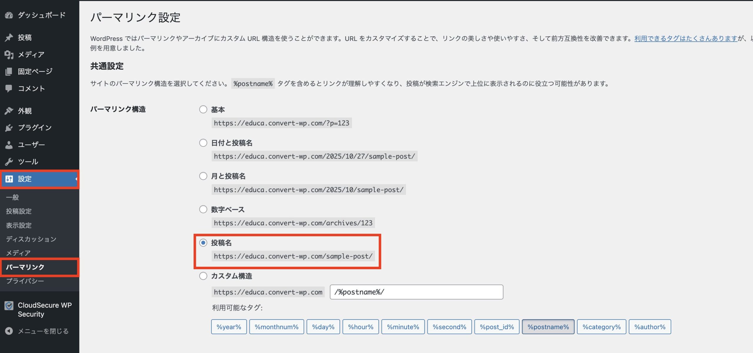 「設定」 → 「パーマリンク設定」 をクリックします。